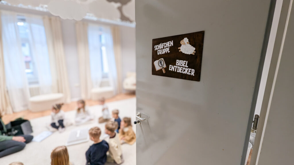 Während des Gottesdienstes findet eine Kinderbetreuung für Kinder im Alter von 3-5 Jahren statt. Diese findet nach den gemeinsamen Liedern am Anfang des Gottesdienstes statt. Die Kinder gehen zusammen mit den Leitern in das Nebengebäude.